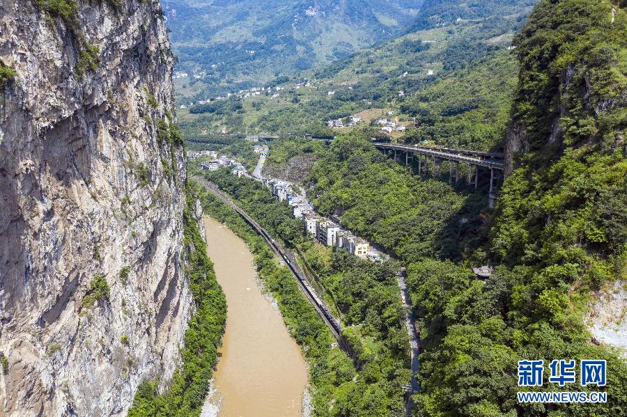 在云南省昭通市鹽津縣豆沙關(guān),五尺道、關(guān)河水道、內(nèi)昆鐵路、G247公路及G85渝昆高速5條不同時(shí)期的交通線路以幾乎并行的姿態(tài)呈現(xiàn)眼前(8月10日攝,無人機(jī)照片)。 新華社記者 江文耀 攝