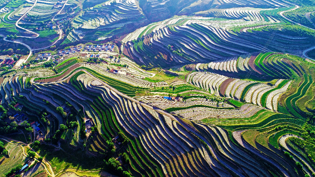 201969號(hào)拍攝于寧夏西吉縣偏城鄉(xiāng)上馬村。早上的太陽剛剛升起,照在薄膜地上猶如一道道發(fā)光的銀線,旱作梯田經(jīng)過改良,壯觀而又美麗。(蔡全錄攝)