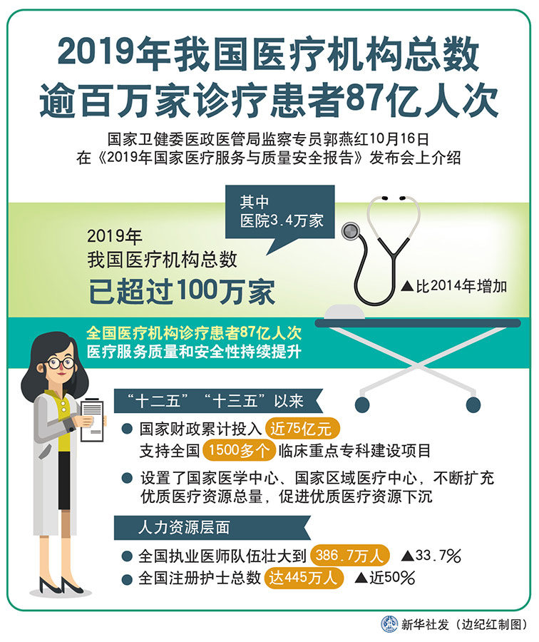 新華社北京10月16日電(記者呂諾、王琳琳)國家衛(wèi)健委醫(yī)政醫(yī)管局監(jiān)察專員郭燕紅16日在《2019年國家醫(yī)療服務(wù)與質(zhì)量安全報(bào)告》發(fā)布會(huì)上介紹,2019年,我國醫(yī)療機(jī)構(gòu)總數(shù)已超過100萬家,其中醫(yī)院3.4萬家。全國醫(yī)療機(jī)構(gòu)診療患者87億人次,醫(yī)療服務(wù)質(zhì)量和安全性持續(xù)提升。
