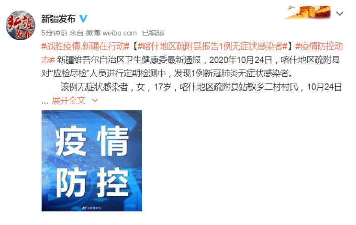 新疆維吾爾自治區衛生健康委最新通報,2020年10月24日,喀什地區疏附縣對“應檢盡檢”人員進行定期檢測中,發現1例新冠肺炎無癥狀感染者。