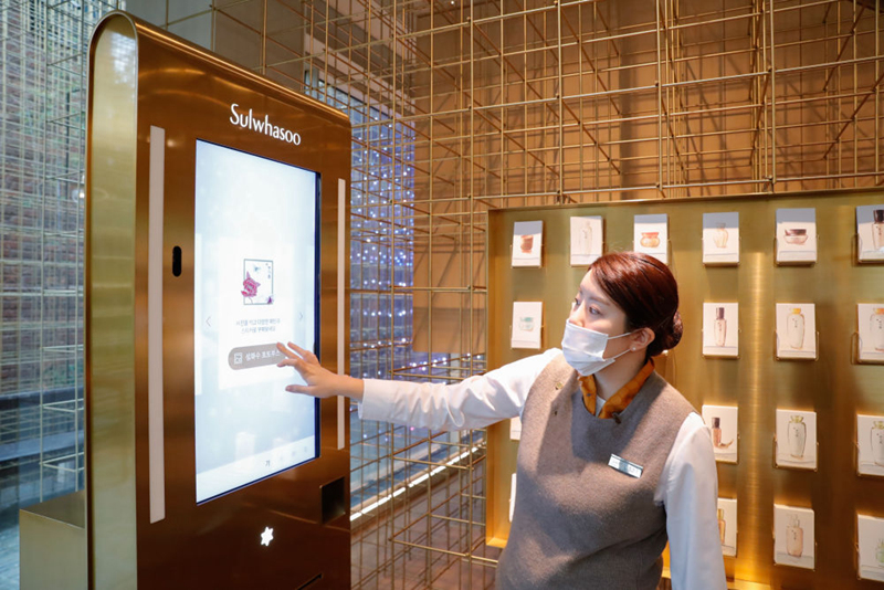 10月27日,工作人員在位于韓國首爾江南區的愛茉莉太平洋雪花秀旗艦店內指導客人體驗店內設施??偛课挥陧n國首爾的美妝企業愛茉莉太平洋集團今年將連續第三次參加進博會。新華社記者 王婧嬙 攝