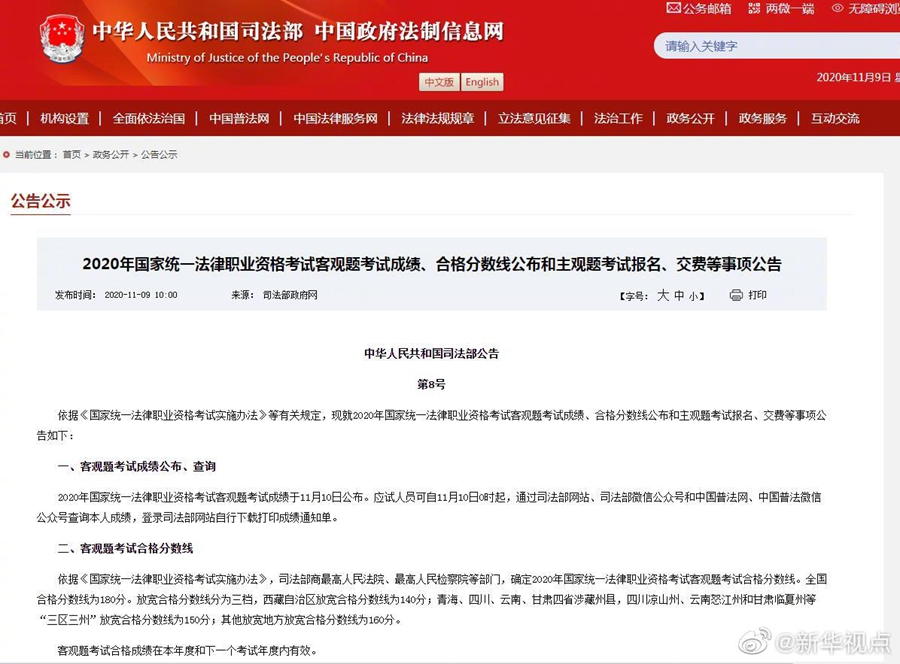 記者9日從司法部獲悉,2020年國家統(tǒng)一法律職業(yè)資格考試客觀題考試成績將于11月10日公布,全國合格分?jǐn)?shù)線為180分。自11月10日0時起,應(yīng)試人員可通過司法部網(wǎng)站、司法部微信公眾號和中國普法網(wǎng)、中國普法微信公眾號查詢成績,登錄司法部網(wǎng)站自行下載打印成績通知單。通過2020年客觀題考試的應(yīng)試人員和2019年客觀題考試保留有效成績?nèi)藛T,應(yīng)于11月10日0時至11月14日24時,登錄司法部網(wǎng)站報名確認(rèn)參加主觀題考試。(記者白陽)