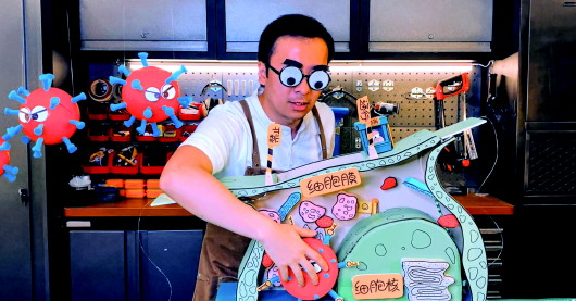 “新型冠狀病毒在細(xì)胞外面游走過(guò)程中,總能找到對(duì)應(yīng)的鎖眼,咔嚓,打開(kāi)細(xì)胞上的鎖,天真的細(xì)胞誤以為營(yíng)養(yǎng)物質(zhì)來(lái)了,于是大門(mén)敞開(kāi)……”在一個(gè)約4分鐘的視頻中,寧原在工作間的長(zhǎng)桌上用自己制作的病毒、細(xì)胞等模型,為粉絲趣味介紹新型冠狀病毒是如何入侵人體的。他還邀請(qǐng)武漢大學(xué)醫(yī)學(xué)部病毒學(xué)研究所專(zhuān)家來(lái)釋疑病毒變異的相關(guān)問(wèn)題,那期視頻獲得了500多萬(wàn)次觀看量。