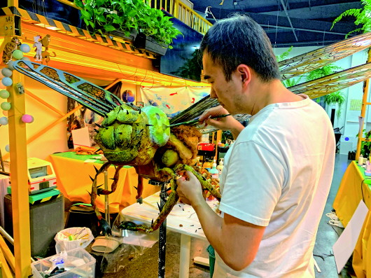 為了給人們解釋蜻蜓如何飛行覓食,寧原制作了一個(gè)放大數(shù)萬(wàn)倍的彩色巨型“蜻蜓隊(duì)長(zhǎng)”模型;為了展示蜘蛛織網(wǎng)的過(guò)程,他不僅制作了一個(gè)龐大的金色蜘蛛,還搭建了紙質(zhì)樹(shù)林立體展板,還原小蜘蛛在樹(shù)林中織網(wǎng)的場(chǎng)景,讓觀眾看完恍然大悟、大呼過(guò)癮。