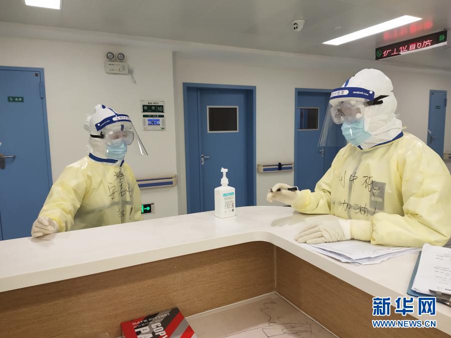 北京大學(xué)人民醫(yī)院創(chuàng)傷救治中心主治醫(yī)師劉中砥(右)在污染區(qū)內(nèi)工作(2月9日攝)。新華社發(fā)