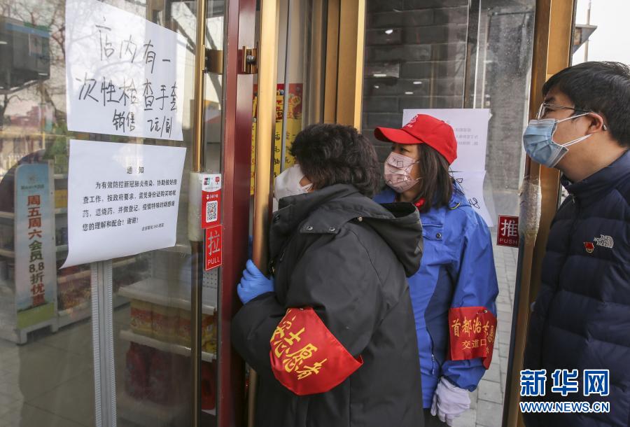 北京市東城區(qū)交道口街道福祥社區(qū)黨委書記李德青(左)去藥店幫居民聯(lián)系購買防疫用品(3月5日攝)。新華社發(fā)