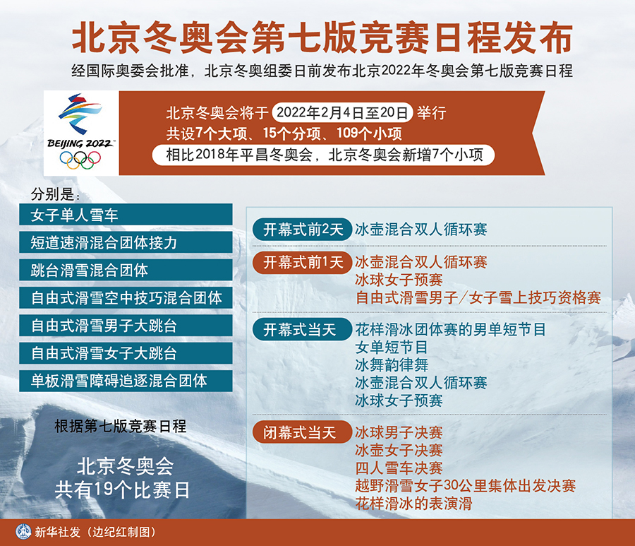 新華社北京11月18日電(記者姬燁、王夢、汪涌)經國際奧委會批準,北京冬奧組委日前發布北京2022年冬奧會第七版競賽日程。隨著籌備工作的深入,北京冬奧會競賽日程仍可能調整。