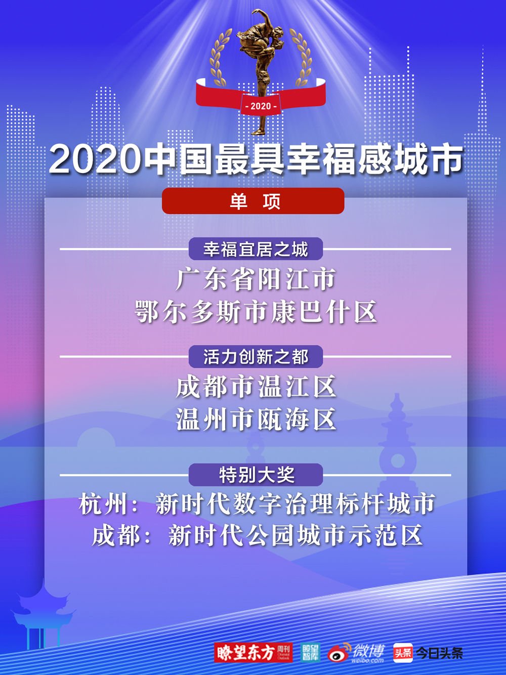 鑒于成都和杭州在城市治理方面的突出成就,組委會特別授予成都“新時代公園城市示范區”稱號、杭州 “新時代數字治理標桿城市”稱號。另外,根據材料申報和大數據單項調查,廣東省陽江市、鄂爾多斯市康巴什區被評為“幸福宜居之城”,成都市溫江區、溫州市甌海區被評為“活力創新之都”。