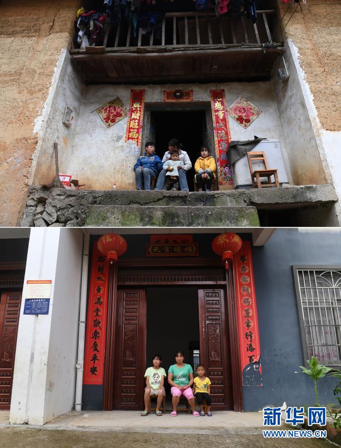 這是一張拼版照片。上圖:在廣西都安瑤族自治縣下坳鎮加八村,白雨璐(右一)和家人坐在家門口(2017年2月9日攝);下圖:在下坳鎮車家莊扶貧搬遷安置新區,白雨璐(左一)和家人坐在家門口(8月18日攝)。新華社記者 陸波岸 攝