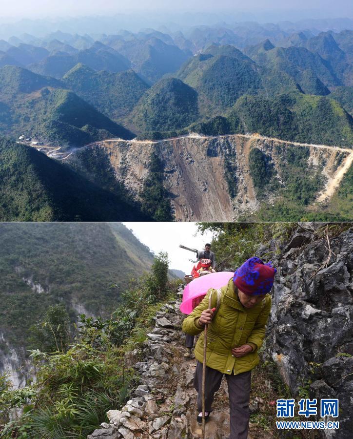這是一張拼版照片。上圖:已經修通水泥路的大化瑤族自治縣板升鄉八好村(2019年11月11日攝,無人機照片);下圖:在尚未通路前,八好村村民背著年貨走山路回家(2016年1月26日攝)。新華社記者 黃孝邦 攝