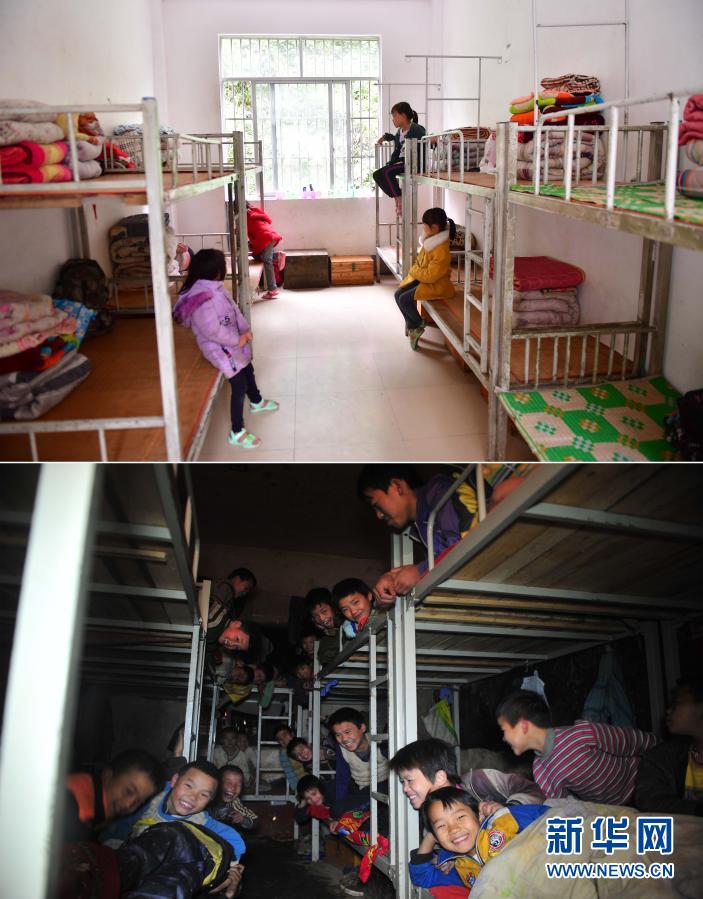這是一張拼版照片。上圖:在大化瑤族自治縣板升鄉弄勇小學,同學們在新宿舍里(2019年5月8日攝);下圖: 2012年12月26日,在弄勇小學,同學們擠在10多平方米的“大通鋪”上準備睡覺。新華社記者 黃孝邦 攝
