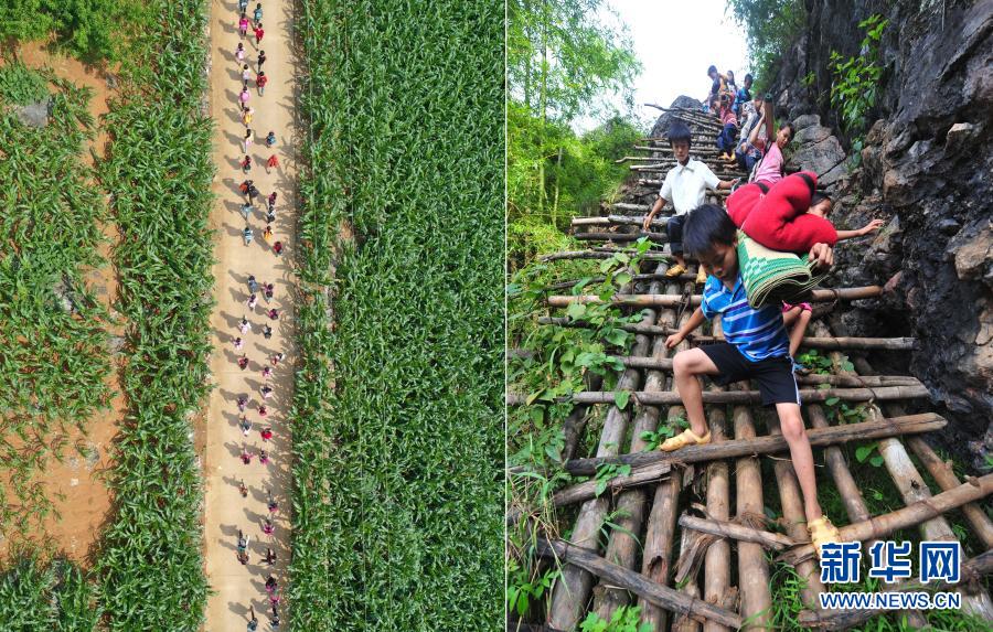 這是一張拼版照片。左圖:在大化瑤族自治縣板升鄉弄勇村,孩子們走在放學路上(2019年5月10日攝,無人機照片);右圖:在弄勇村弄頂屯,孩子們扛著生活用具,爬懸梯上學(2012年9月3日攝)。目前,弄勇村所有的屯都已告別沒有公路的歷史。新華社記者 黃孝邦 攝