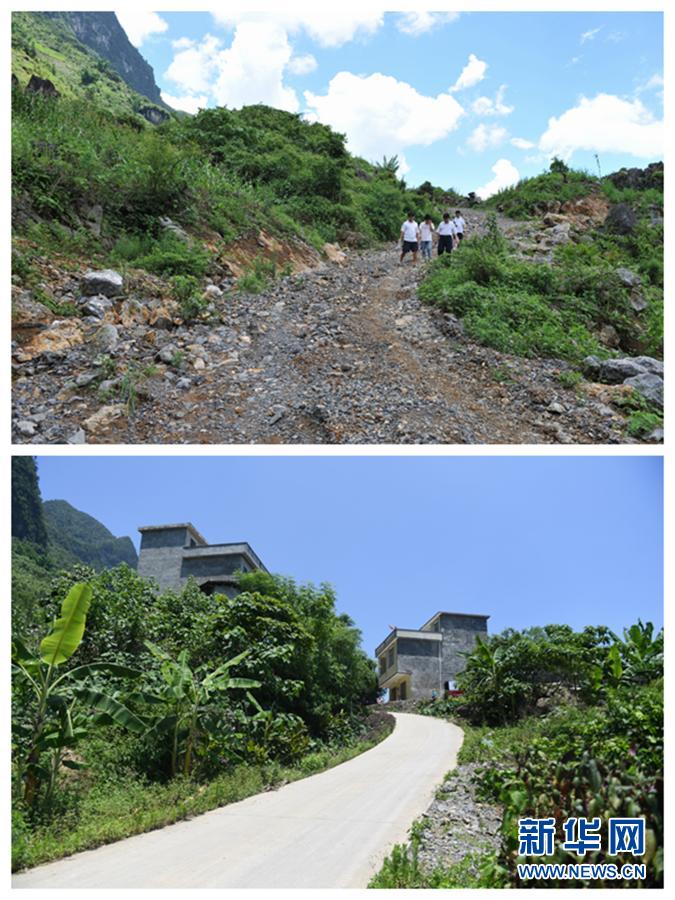 這是一張拼版照片:上圖:廣西那坡縣邊境零公里線上甲柳村上保屯的進屯路(2009年7月14日攝);下圖:甲柳村上保屯現在的道路(2018年6月7日攝)。新華社記者 張愛林 攝