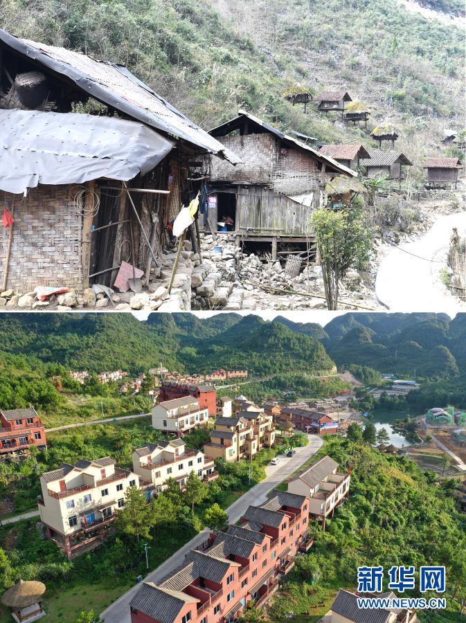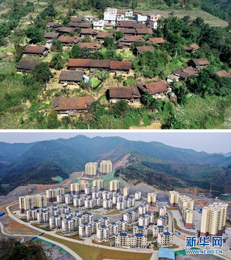 這是一張拼版照片。上圖:廣西百色市隆林各族自治縣金鐘山鄉平流村坡安屯群眾搬遷前的住房(2017年7月21日攝,無人機照片);下圖:平流村坡安屯群眾搬遷到安置點的新住房(2019年12月3日攝)。新華社記者 張愛林 攝