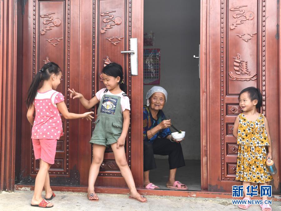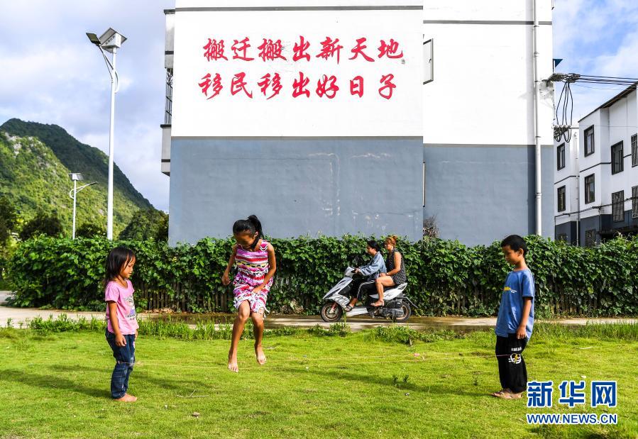 在廣西都安瑤族自治縣下坳鎮車家莊易地扶貧搬遷安置新區,小朋友在玩耍(8月18日攝)。新華社記者 周華 攝