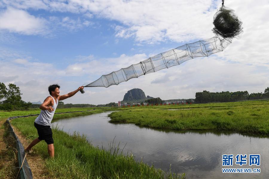 在廣西武宣縣祿新鎮上堂村稻蝦輪作養殖示范基地,村民將捕蝦籠拋入蝦塘中(6月17日攝)。新華社記者 曹祎銘 攝