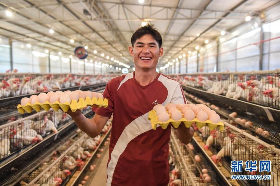 廣西武宣縣金雞鄉仁元村的返鄉創業者覃永靈在養殖場內展示他收獲的雞蛋(6月18日攝)。新華社記者 曹祎銘 攝