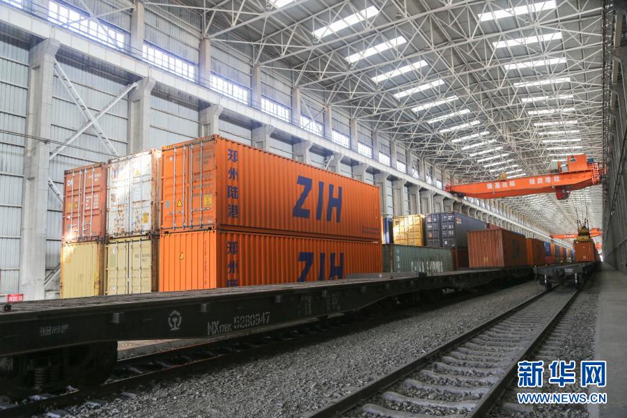 新疆阿拉山口站綜合換裝庫(三區)內等待換裝的集裝箱(9月29日攝)。新華社發(于蘇甫·艾尼 攝)