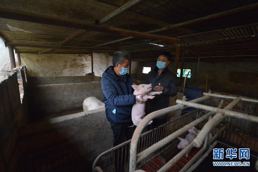 11月17日,范三林(左)與駐村扶貧工作隊(duì)隊(duì)長張亮亮檢查仔豬生長狀況。新華社記者 范世輝 攝