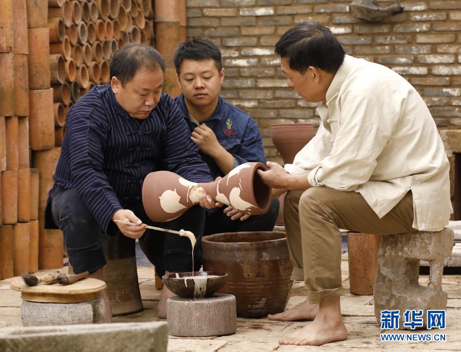 平頂山學(xué)院陶瓷學(xué)院院長梅國建(右一)指導(dǎo)徒弟為花瓷腰鼓施斑釉(資料照片)。新華社發(fā)