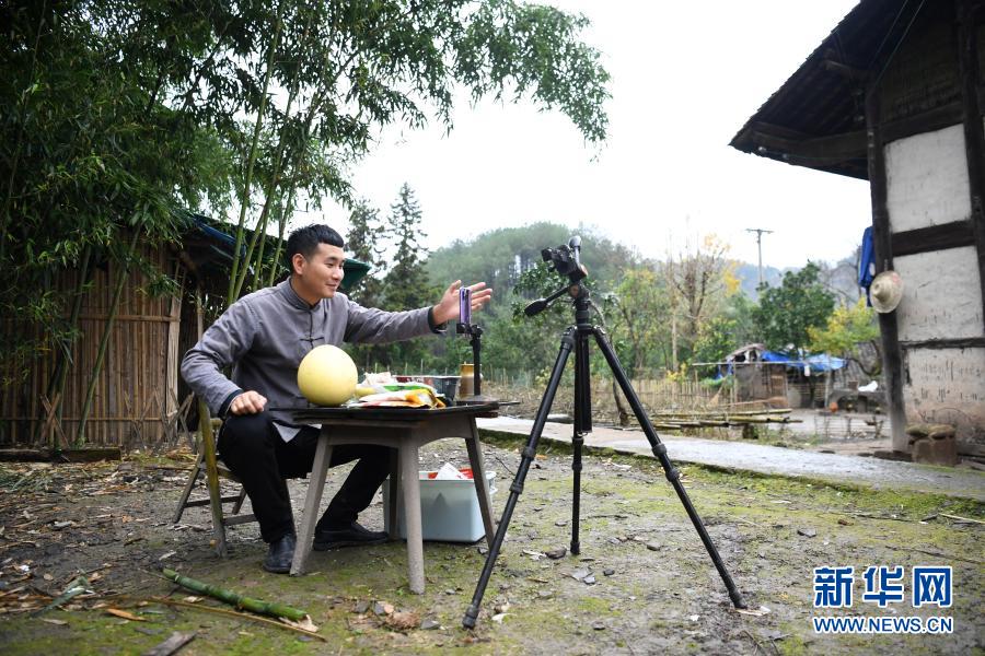 梁平七星鎮小伙曾慶貴通過網絡直播推銷家鄉特色農產品(11月18日攝)。新華社記者 唐奕 攝