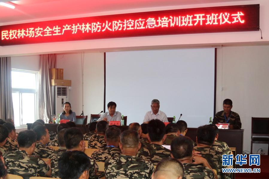石立忠(臺上左二)和翟文杰(臺上右一)在民權林場安全生產護林防火防控應急培訓班開班儀式上(資料照片)。新華社發