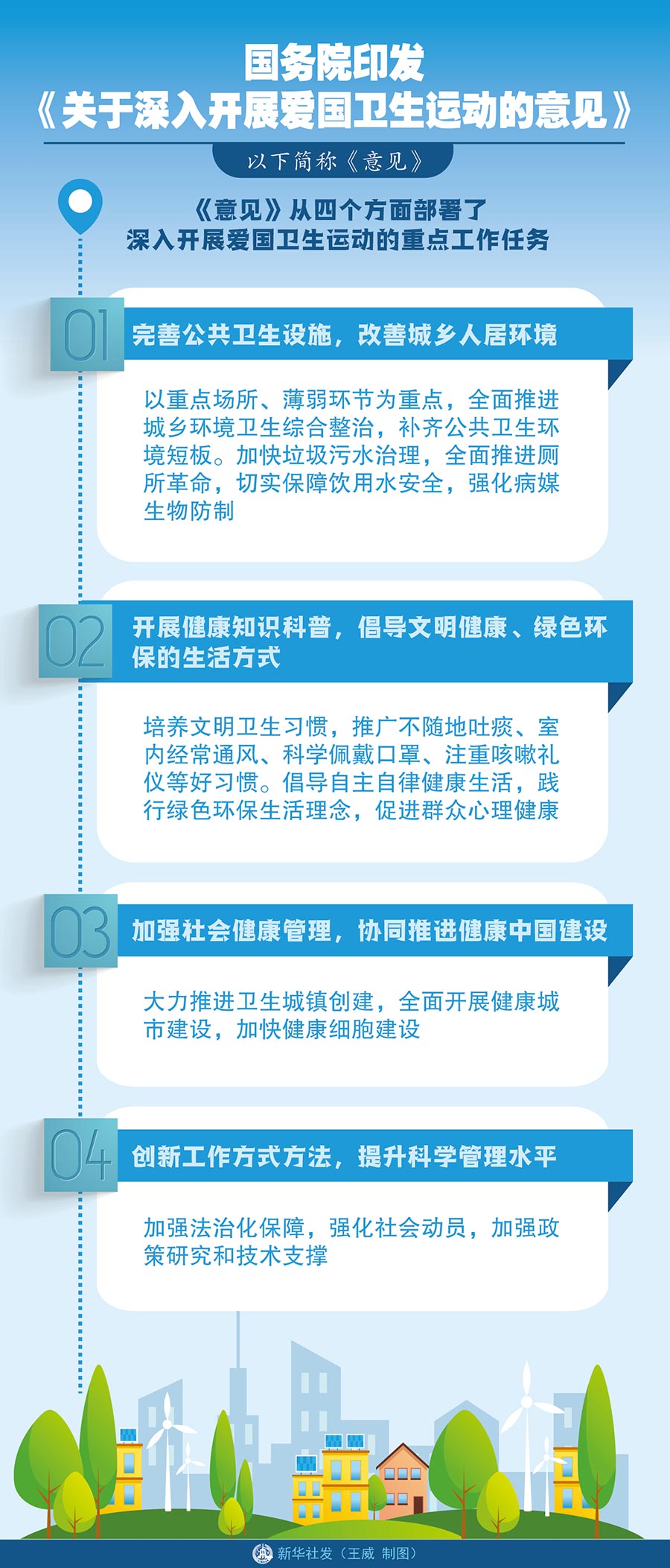 《意見》從四個方面部署了深入開展愛國衛生運動的重點工作任務。一是完善公共衛生設施,改善城鄉人居環境。以重點場所、薄弱環節為重點,全面推進城鄉環境衛生綜合整治,補齊公共衛生環境短板。加快垃圾污水治理,全面推進廁所革命,切實保障飲用水安全,強化病媒生物防制。二是開展健康知識科普,倡導文明健康、綠色環保的生活方式。培養文明衛生習慣,推廣不隨地吐痰、室內經常通風、科學佩戴口罩、注重咳嗽禮儀等好習慣。倡導自主自律健康生活,踐行綠色環保生活理念,促進群眾心理健康。三是加強社會健康管理,協同推進健康中國建設。大力推進衛生城鎮創建,全面開展健康城市建設,加快健康細胞建設。四是創新工作方式方法,提升科學管理水平。加強法治化保障,強化社會動員,加強政策研究和技術支撐。
