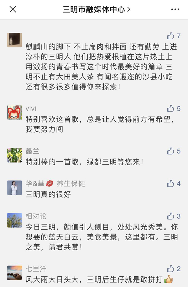 “我大福建真是處處美得沒話說!”“哈哈,我大沙縣又壓軸了。”“太好聽了!內(nèi)心充滿自豪!”“開門見綠,抬頭見藍(lán),這就是我的家鄉(xiāng)。”還有網(wǎng)友希望這首歌“能上春晚”。更有網(wǎng)友吟誦起三明,“好山好水好風(fēng)情,數(shù)一數(shù)二數(shù)三明。紅軍長征出發(fā)地,客家文化傳世界 …… ”