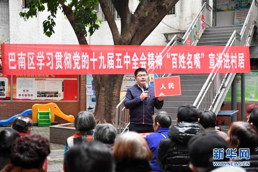 12月1日,宣講員向群眾宣講黨的十九屆五中全會(huì)精神。12月1日,重慶市巴南區(qū)魚洞街道魚新街社區(qū)舉行學(xué)習(xí)貫徹黨的十九屆五中全會(huì)精神“百姓名嘴”進(jìn)村居活動(dòng)。據(jù)介紹,重慶市巴南區(qū)“百姓名嘴”宣講團(tuán)是由基層干部、教師、民間藝人等基層理論骨干自愿組成的理論宣講隊(duì)伍,現(xiàn)有宣講員85名。宣講團(tuán)成員將理論宣講與評(píng)書、快板、三句半、木洞山歌等文藝形式相結(jié)合,目前已在巴南區(qū)開展了110余場(chǎng)學(xué)習(xí)貫徹黨的十九屆五中全會(huì)精神宣講活動(dòng)。新華社記者 唐奕 攝