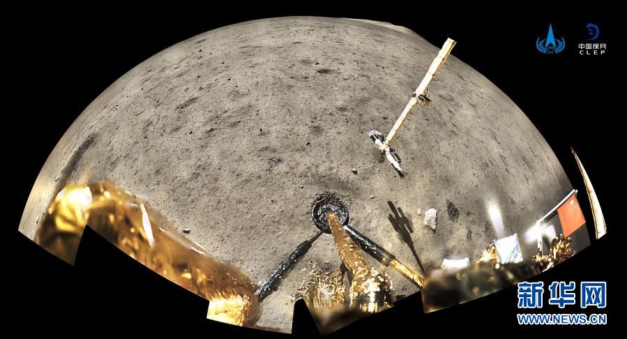 嫦娥五號著陸器和上升器組合體全景相機環(huán)拍成像,五星紅旗在月面成功展開,此外圖像上方可見已完成表取采樣的機械臂及采樣器。新華社發(fā)(國家航天局供圖)
