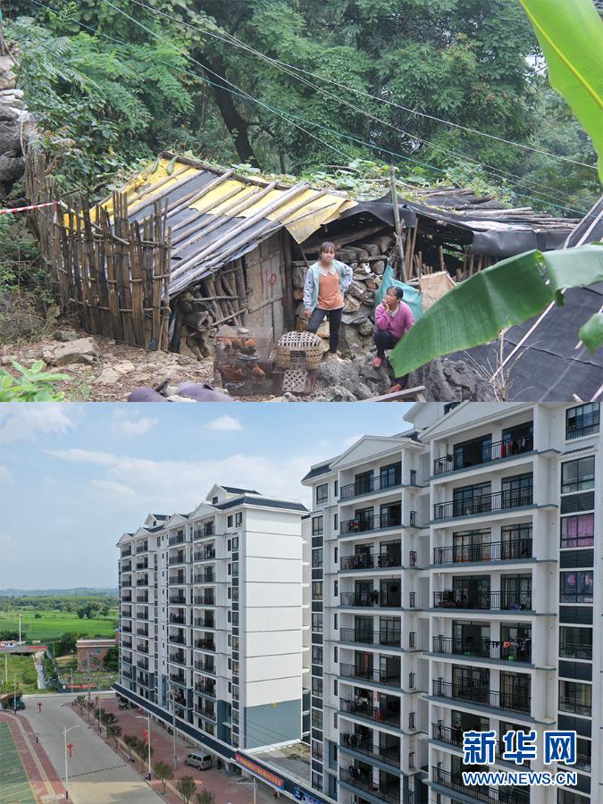 這是一張拼版照片,上圖為:2018年11月11日在廣西田東縣思林鎮(zhèn)龍邦村拍攝的村民和自家簡陋的房屋(思林鎮(zhèn)政府供圖);下圖為:2019年8月28日拍攝的當?shù)貫辇埌畲逍陆ǖ奈挥趶V西田東縣思林鎮(zhèn)的易地扶貧搬遷安置點(無人機照片,新華社記者 曹祎銘 攝)。新華社發(fā)