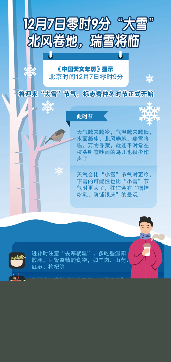 歷史學(xué)者、天津社科院研究員羅澍偉介紹,“大雪”是二十四節(jié)氣中的第二十一個(gè)節(jié)氣,也是冬季的第三個(gè)節(jié)氣。此時(shí)節(jié),天氣會(huì)比“小雪”節(jié)氣時(shí)更冷,下雪的可能性也比“小雪”節(jié)氣時(shí)更大了,往往會(huì)有“檐掛冰乳,階鋪銀床”的景觀。可見(jiàn)“大雪”與“小雪”“雨水”“谷雨”一樣,是直接反映降水狀況的節(jié)氣。