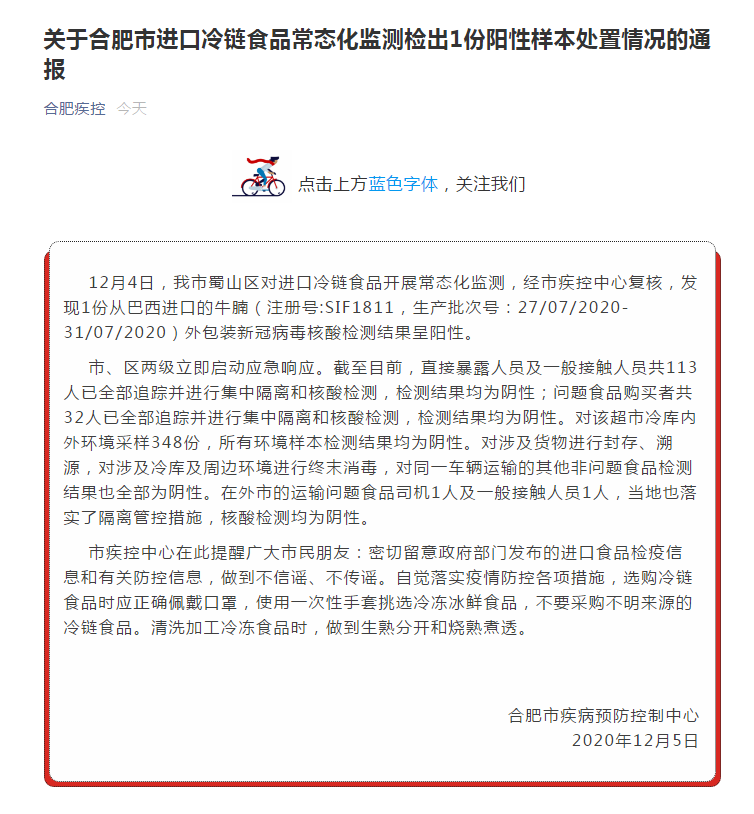 12月4日,合肥市蜀山區對進口冷鏈食品開展常態化監測,經市疾控中心復核,發現1份從巴西進口的牛腩(注冊號:SIF1811,生產批次號:27/07/2020-31/07/2020)外包裝新冠病毒核酸檢測結果呈陽性。
