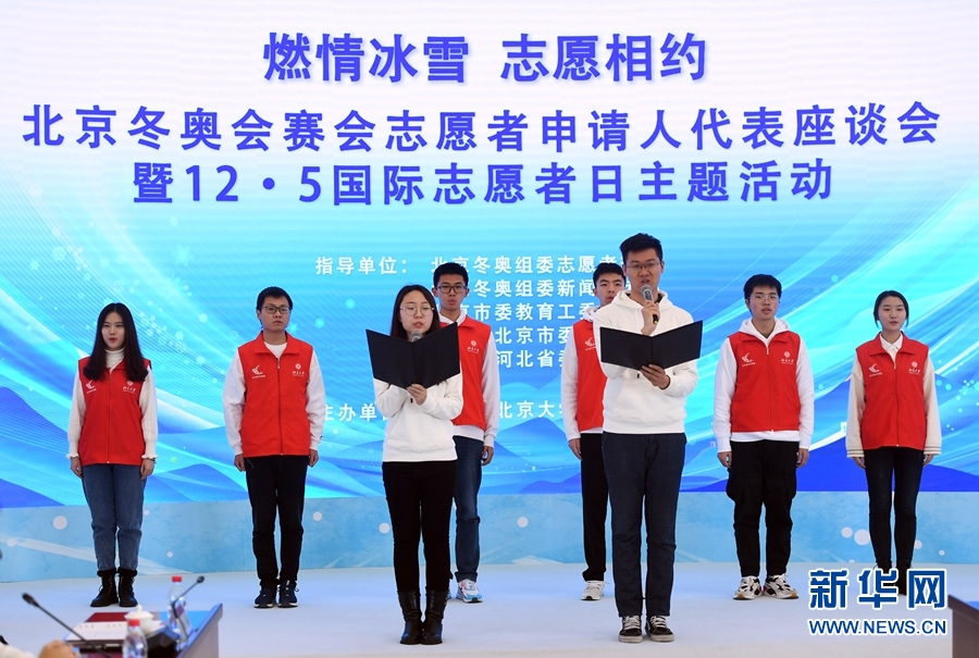 12月5日,北京大學青年志愿者在活動中宣讀《北京冬奧會賽會志愿者申請人倡議書》。新華社記者 任超 攝