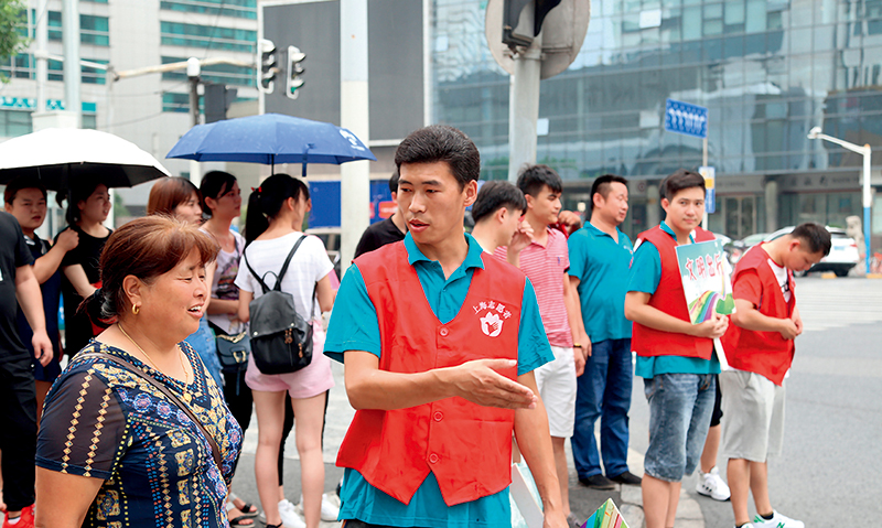 2018年夏季,快遞小哥柴閃閃在上海火車站南廣場恒豐路口做文明出行的指路志愿者
