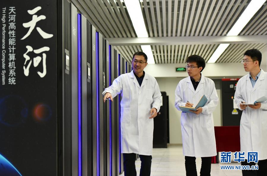 在國家超級(jí)計(jì)算天津中心“天河三號(hào)”原型機(jī)機(jī)房內(nèi),應(yīng)用研發(fā)部部長孟祥飛(左)和同事一起巡查(2019年4月24日攝)。新華社記者 李然 攝
