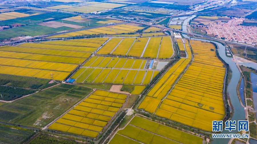 9月22日拍攝的河北省唐山市蘆臺經濟開發區海北鎮的水稻田(無人機照片)。