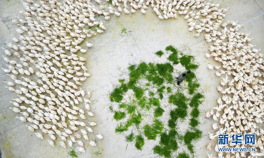 工人在貴州省黔東南苗族侗族自治州錦屏縣馬臺(tái)商品鵝養(yǎng)殖基地投放草料(3月11日攝,無人機(jī)照片)。新華社記者 楊文斌 攝