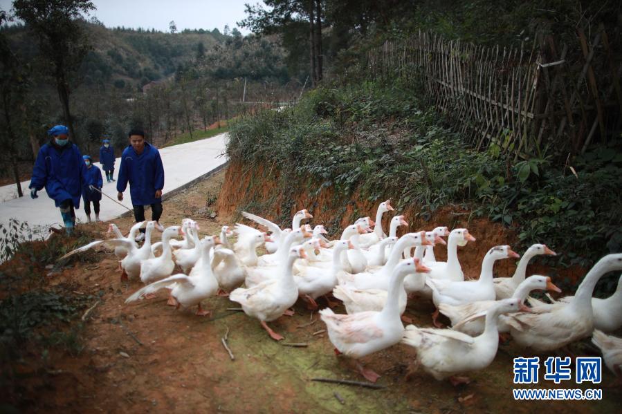 工作人員在貴州省黔東南苗族侗族自治州錦屏縣馬臺(tái)商品鵝養(yǎng)殖基地養(yǎng)鵝(12月8日攝)。新華社記者 劉續(xù) 攝