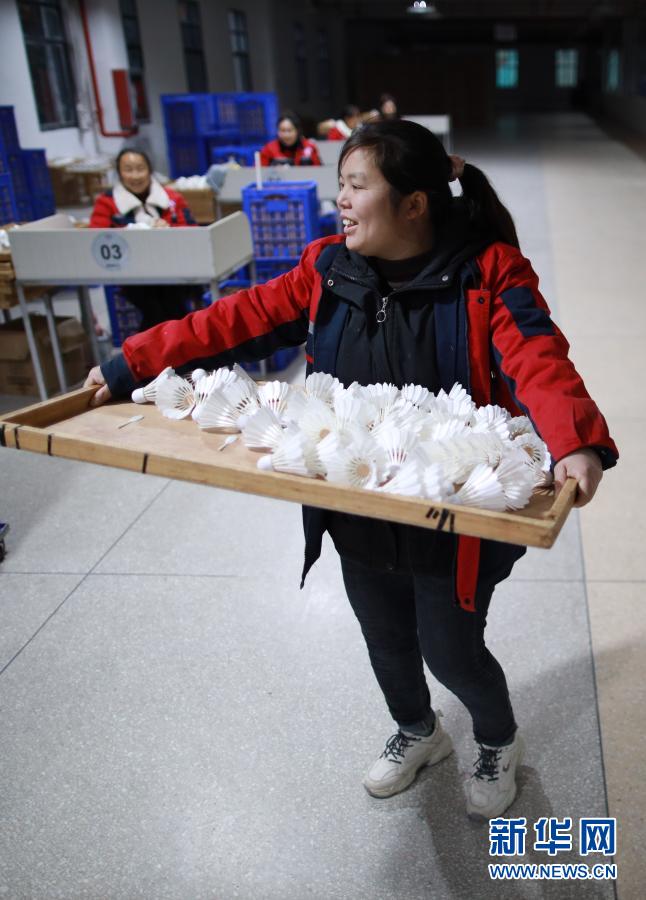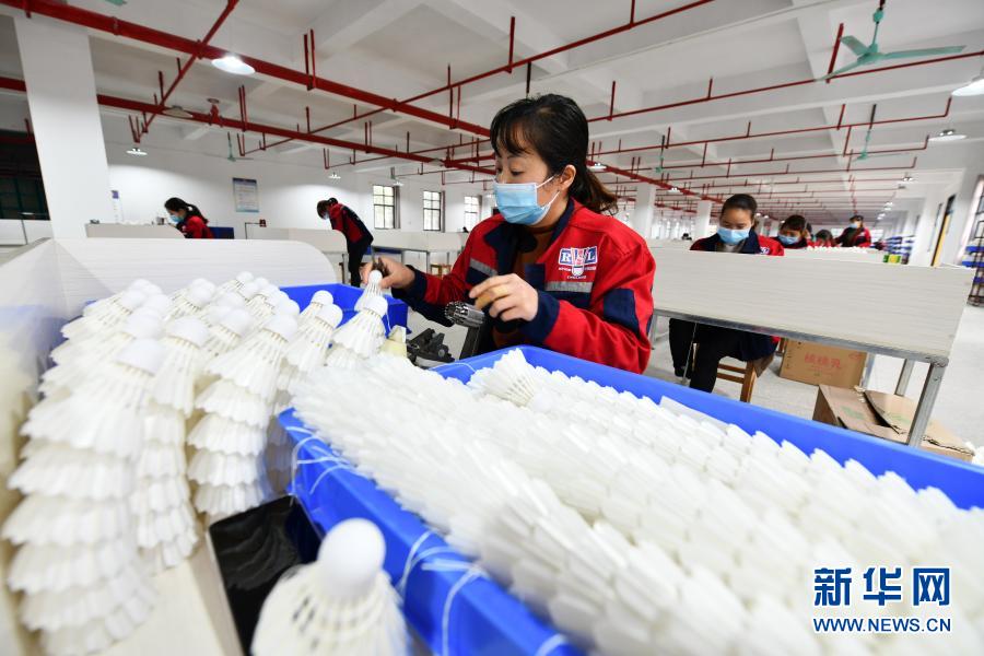 工人在位于貴州省錦屏縣敦寨鎮(zhèn)的貴州亞獅龍?bào)w育文化產(chǎn)業(yè)發(fā)展有限公司羽毛球加工廠工作(12月8日攝)。新華社記者 劉續(xù) 攝