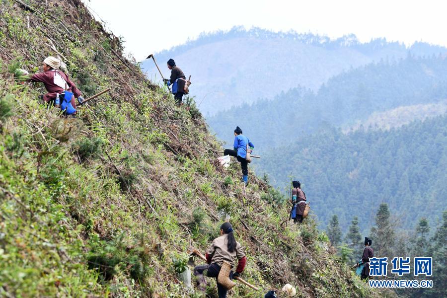 村民在貴州省錦屏縣春蕾林場(chǎng)的山坡上植樹(3月12日攝)。新華社記者 楊文斌 攝