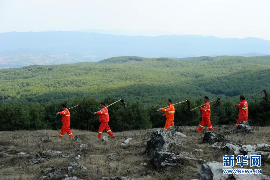 貴州省威寧縣觀風(fēng)海鎮(zhèn)沙子坡林場(chǎng)的護(hù)林員在林區(qū)進(jìn)行火險(xiǎn)巡查(2018年3月10日攝)。新華社記者 楊文斌 攝