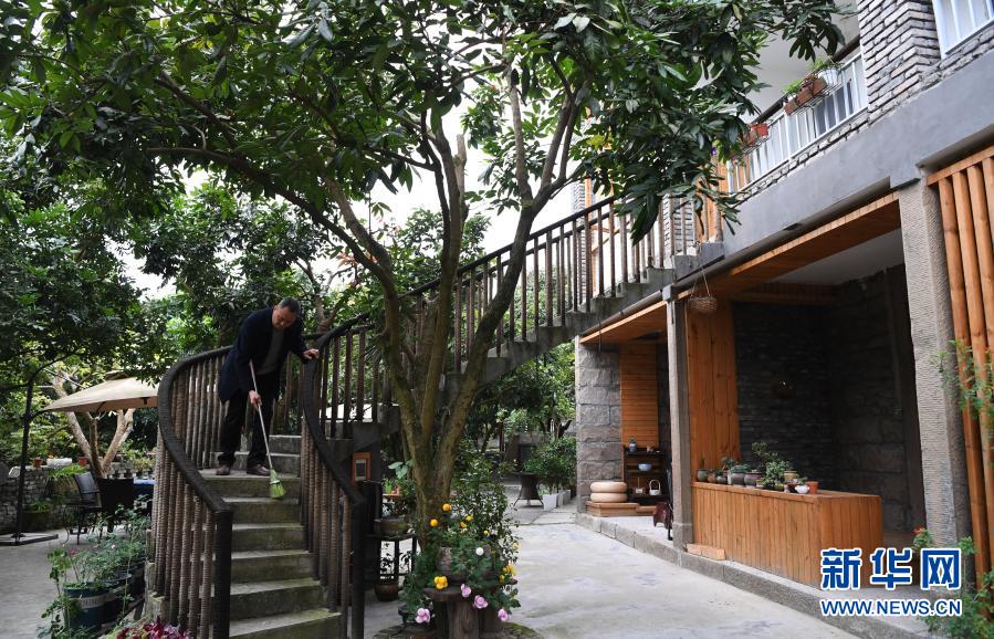 重慶市萬州區大周鎮五土村一民宿工作人員在院子里打掃衛生(12月10日攝)。新華社記者 王全超 攝