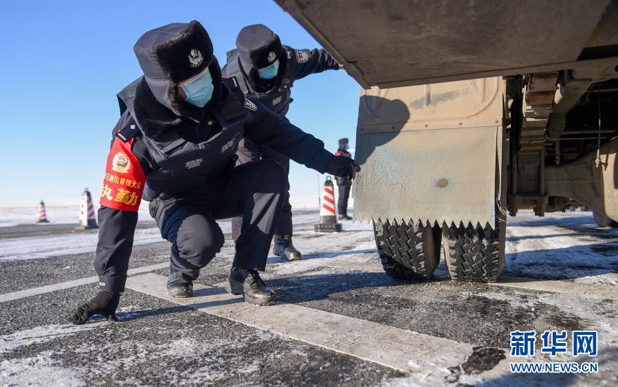 12月15日,內(nèi)蒙古烏蘭察布邊境管理支隊(duì)腦木更邊境派出所民警在主著陸場區(qū)附近檢查來往車輛。新華社記者 連振 攝
