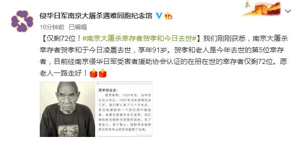 侵華日軍南京大屠殺遇難同胞紀念館18日發(fā)布消息,南京大屠殺幸存者賀孝和于2020年12月18日凌晨去世,享年91歲。