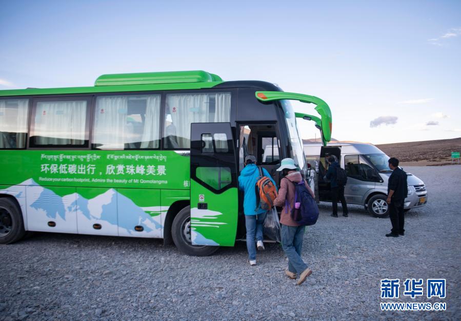 游客在珠穆朗瑪峰景區停車場轉乘環保客車(2019年5月16日攝)。珠穆朗瑪峰景區內自2019年5月開始試運營清潔能源環??蛙?,以進一步平衡珠峰地區旅游發展與環境保護需要。新華社記者 孫非 攝