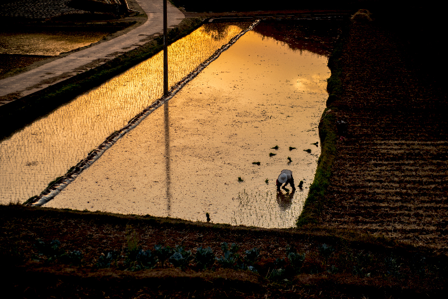????云南省南華縣龍川鎮二街社區位于城鎮南部31公里的山區,平均海拔1780米。2019年5月12日下午,拍攝者從二街社區田間地頭了解村民生活情況,返回時,正好夕陽西下,水田地里,霞光、水、人構成和諧、美好的畫卷。 傅敢峰 攝