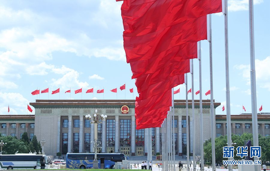 5月27日,中國人民政治協商會議第十三屆全國委員會第三次會議在北京人民大會堂舉行閉幕會。這是天安門廣場上紅旗飄揚。 新華網 翟子赫 攝