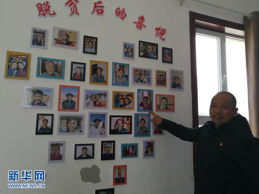 青海省黃南藏族自治州尖扎縣尖扎灘鄉(xiāng)來(lái)玉村扶貧第一書記李玉棟向記者介紹來(lái)玉村“脫貧后的喜悅”。照片墻集納了村民們脫貧后的笑臉照片(2020年12月11日攝)。新華社記者 顧玲 攝