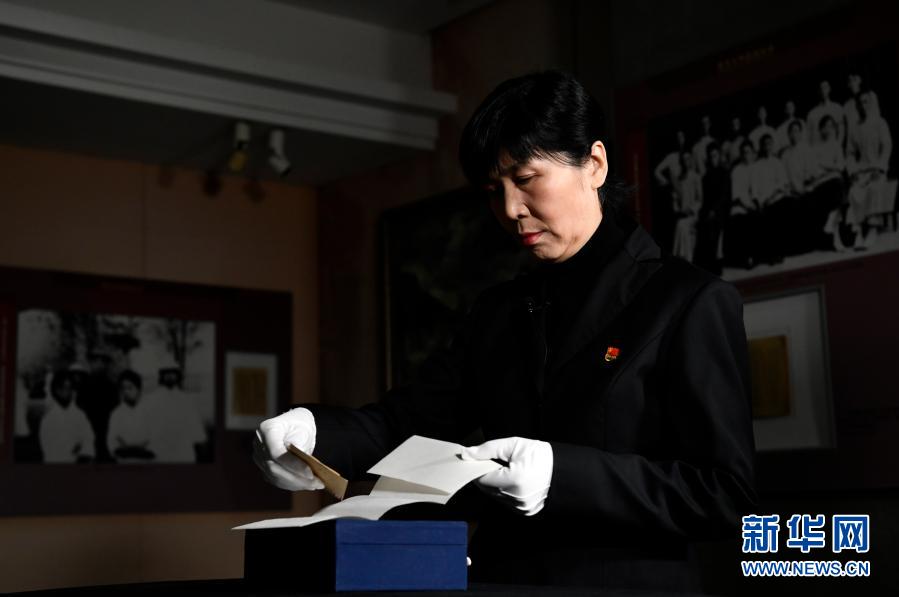周恩來(lái)鄧穎超紀(jì)念館陳列保管部副主任李勤從一個(gè)藍(lán)色小箱子中拿出列席證(2020年12月23日攝)。新華社記者 李然 攝